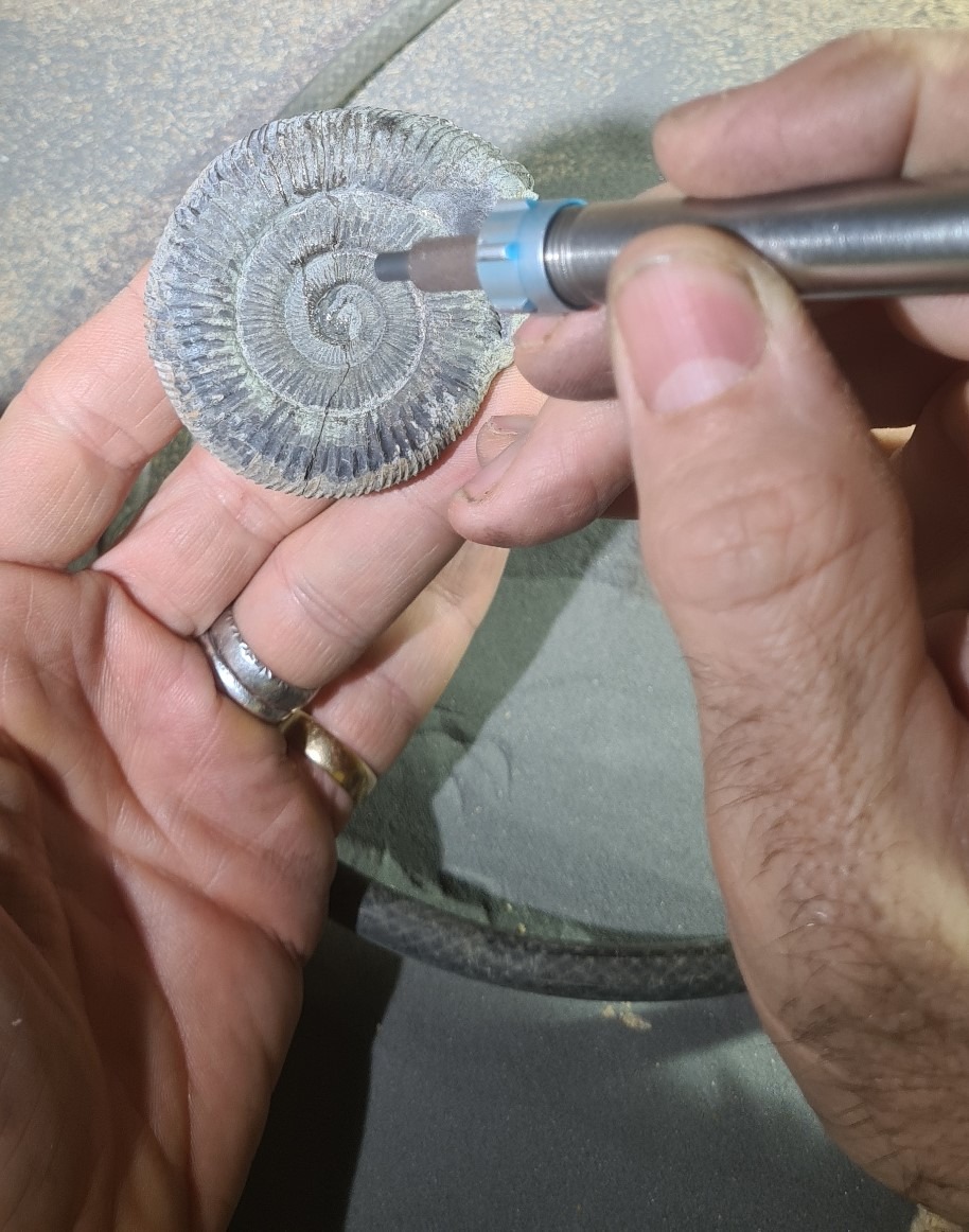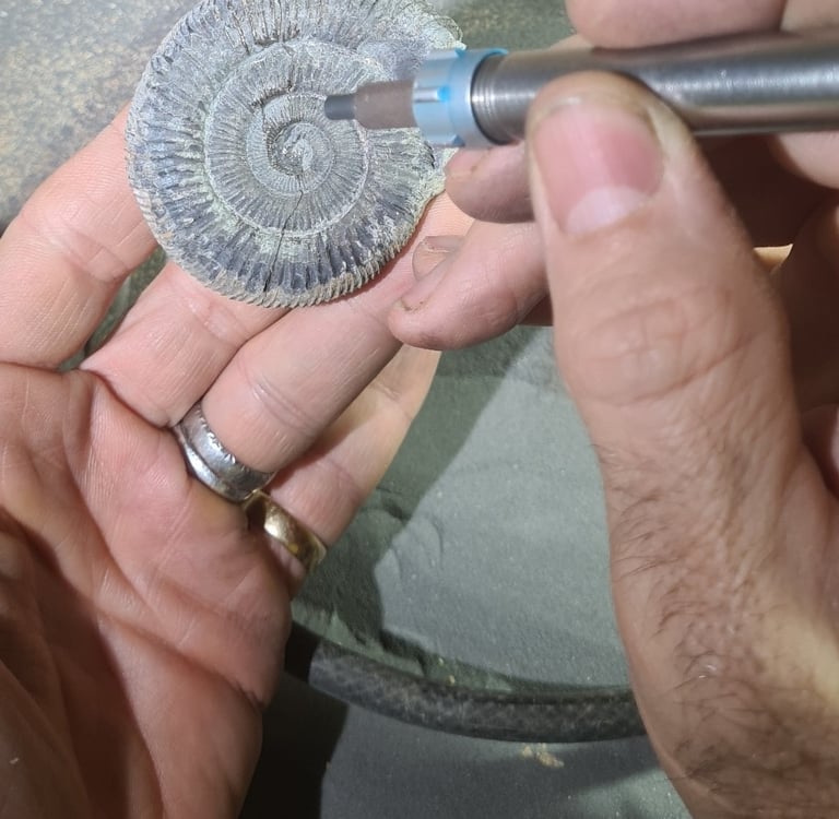 At selissof-workshop we employ a range of high precision pneumatic tools which enable the processing of fossils, from the removal of coarse matrices to the careful preparation of the finest details.
