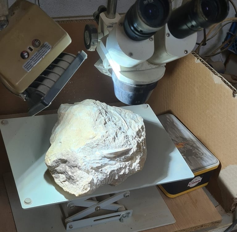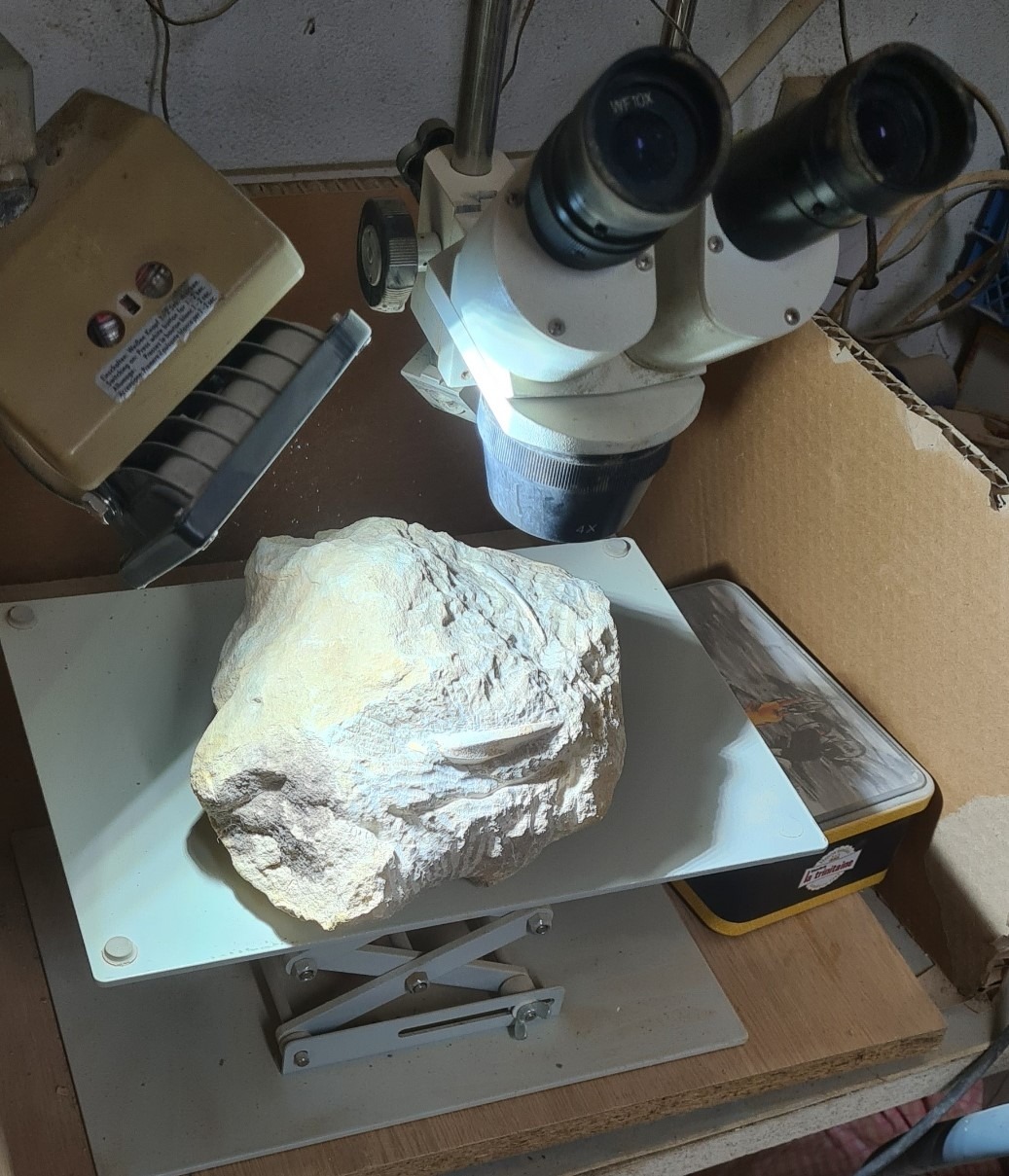 We currently offer an acid preparation, particularly suitable for phosphated bone fossils contained in limestone. In addition, for marly gangues, we use potash (KOH), which allows targeted and effective removal of the matrix while preserving the integrity of the fossil.