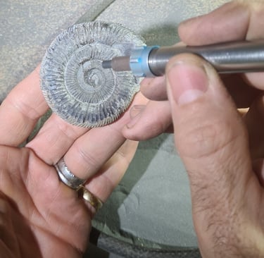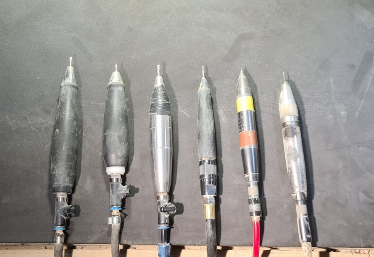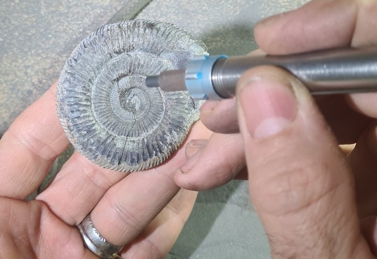 Chez selissof-workshop, nous employons une gamme d'outils pneumatiques de haute précision qui permettent de traiter les fossiles, depuis l'élimination de matrices grossières jusqu'à la préparation minutieuse des détails les plus fins.